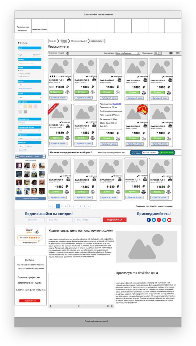 Перед нами стояла задача разработать интернет магазин под ключ на CMS Opencart по продаже автомалярной продукции. Изучив рынок, мы приступили к разработке прототипов основных и дополнительных страниц сайта. Также были разработаны мобильные версии интернет магазина. При разработке мобильных версий применялся передовой зарубежный опыт таких онлайн магазинов как Zappos.com Amazon.com, такой подход позволяет нивелировать скорость изменений в онлайн бизнесе. Так как сама разработка дизайна и верстка занимает от 2-6 месяцев ( в зависимости от сложности проекта) мы постарались опередить, предстоящие изменения. Паралельно этапу прототипирования производилась разработка детального технического задания, так как очень важно прописать весь планируемый функционал, как всё будет устроено и как будет работать. Такие понятия как: "должно всё работать", являются неоднозначными для программистов, поэтому без технического задания шансы на разработку интернет-магазина под ключ снижаются.